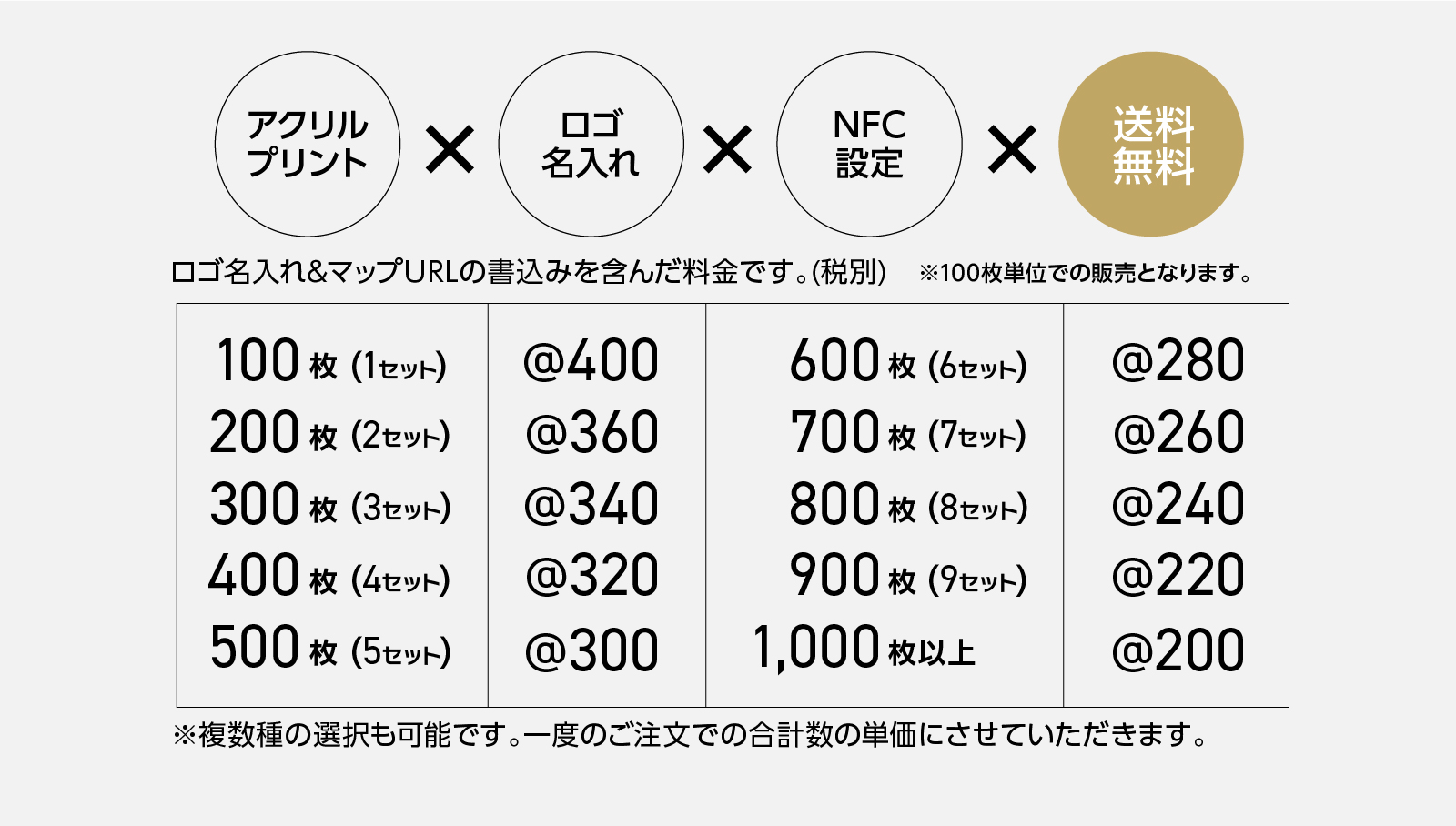 複数のデザインをお選びいただいても、1回のご注文数の合計で、お得な単価割引となります。 - お好きなセット数を入力ください。100枚入り1セットです。