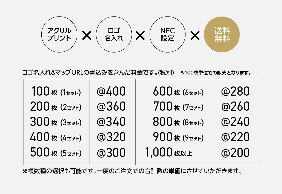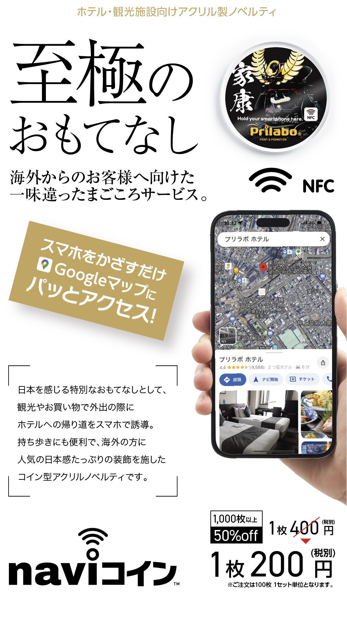 裏面のNFCタグにホテル(施設)の所在地情報を登録した後、全品検品の上、無料配送いたします。