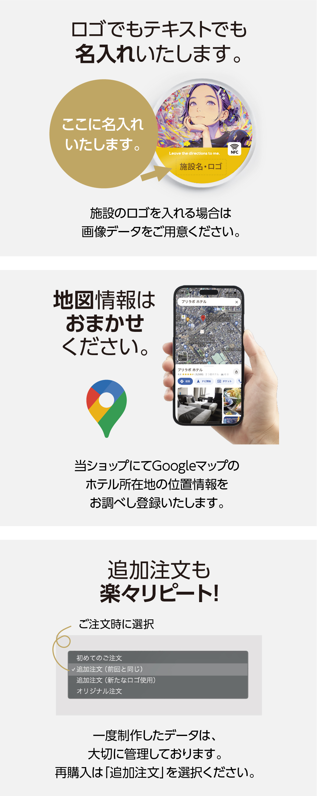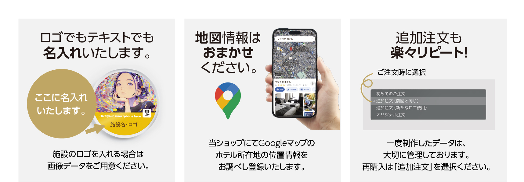 オリジナリティを高めるためホテルの名入れやマップURLも当ショップで、登録いたします。
