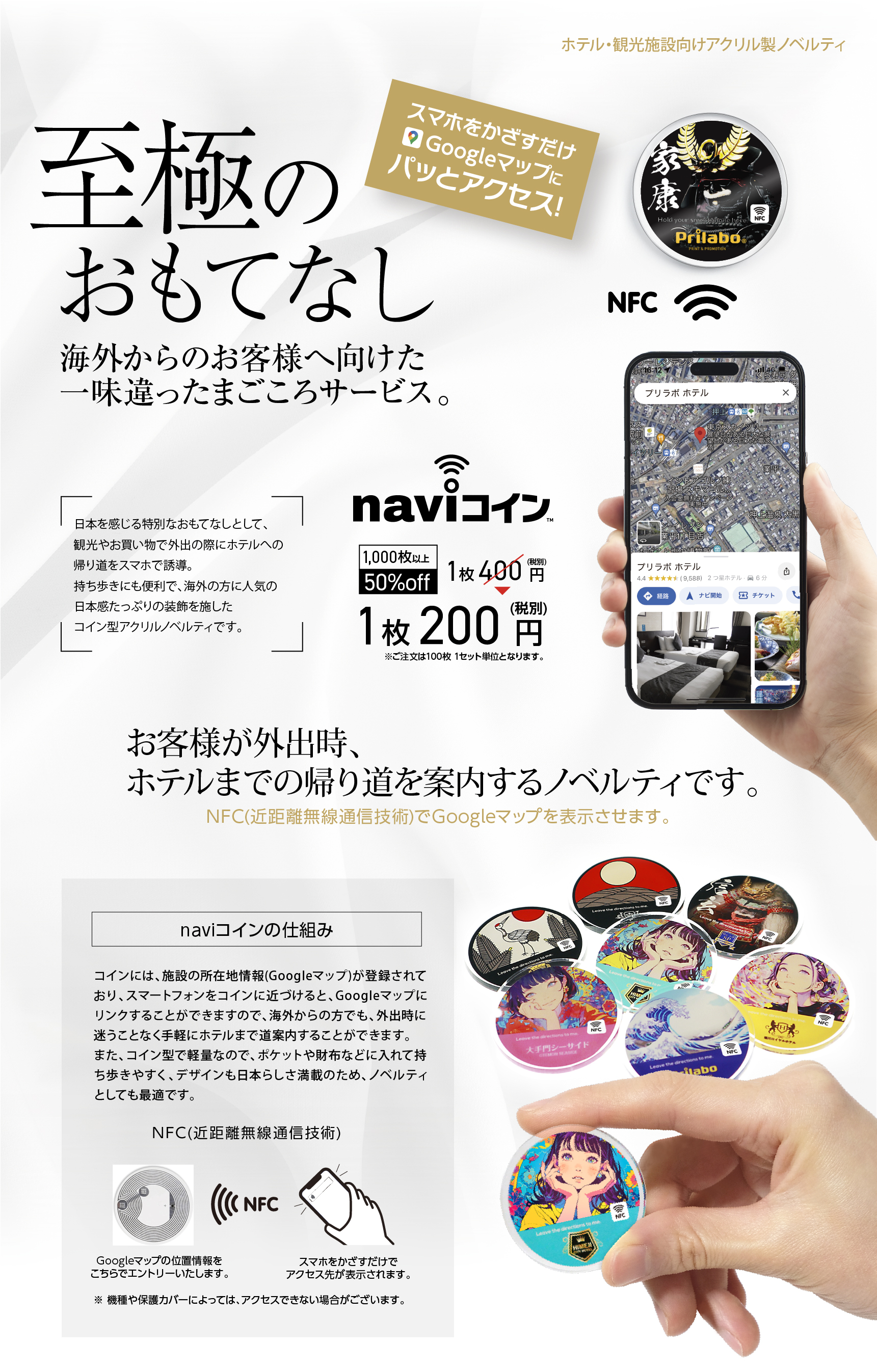 コインには、施設の所在地情報(Googleマップ)が登録されており、スマートフォンをコインに近づけると、Googleマップにリンクすることができますので、海外からの方でも、外出時に迷うことなく手軽にホテルまで道案内することができます。また、コイン型で軽量なので、ポケットや財布などに入れて持ち歩きやすく、デザインも日本らしさ満載のため、ノベルティとしても最適です。